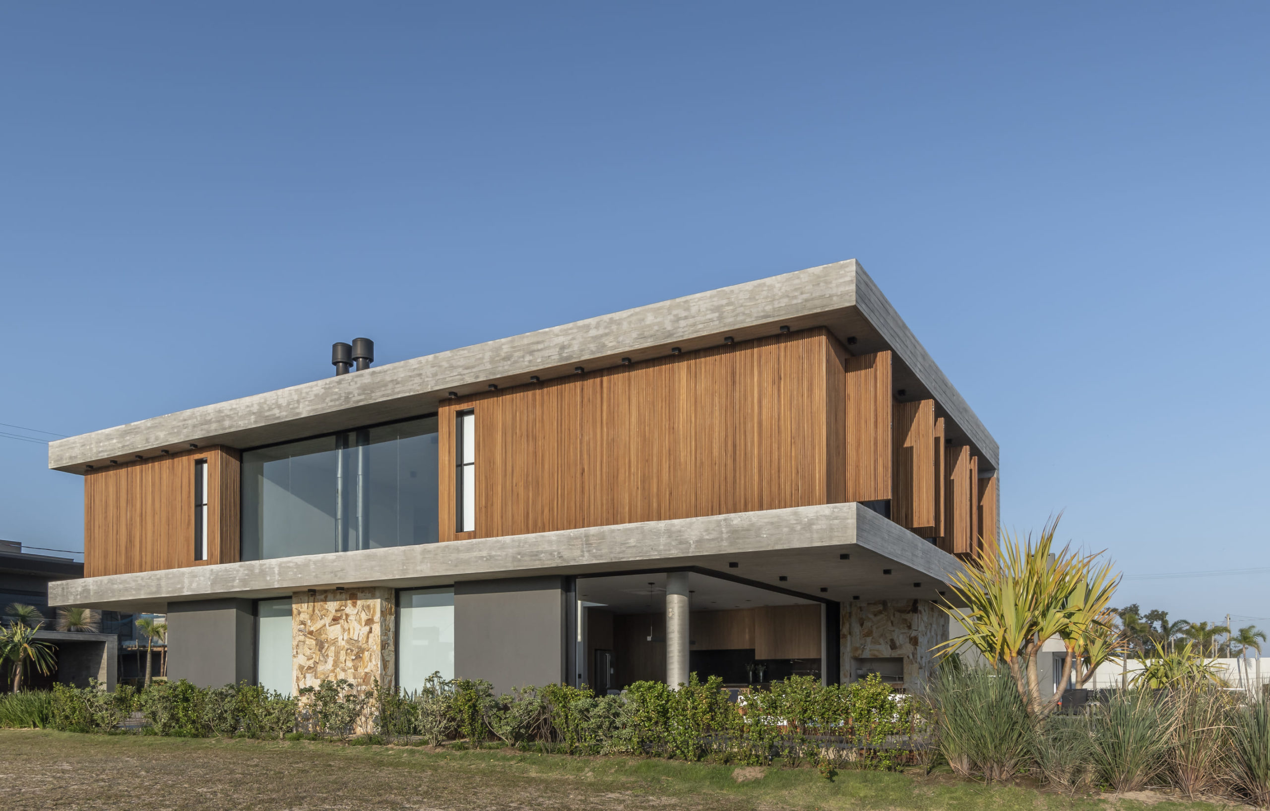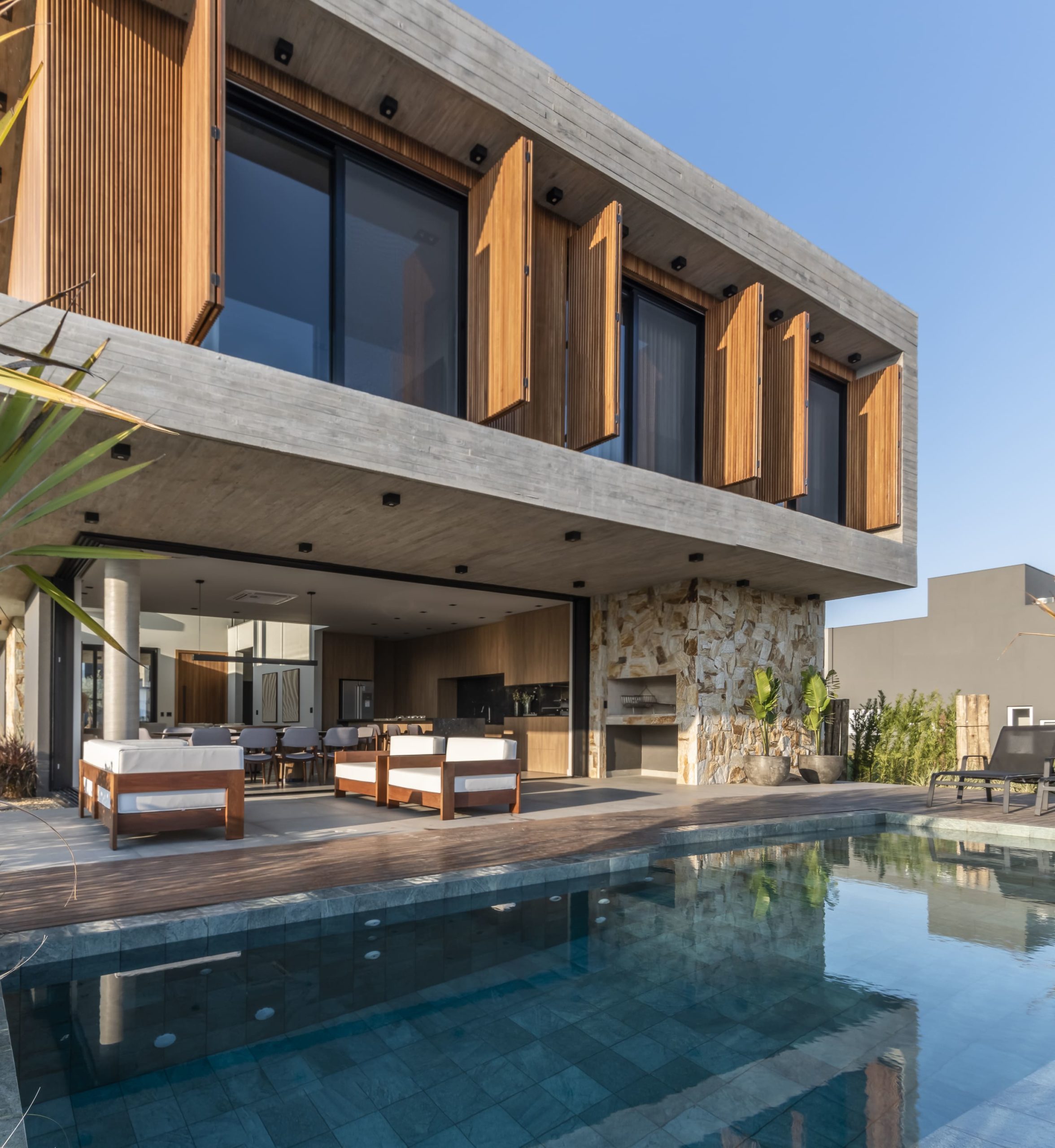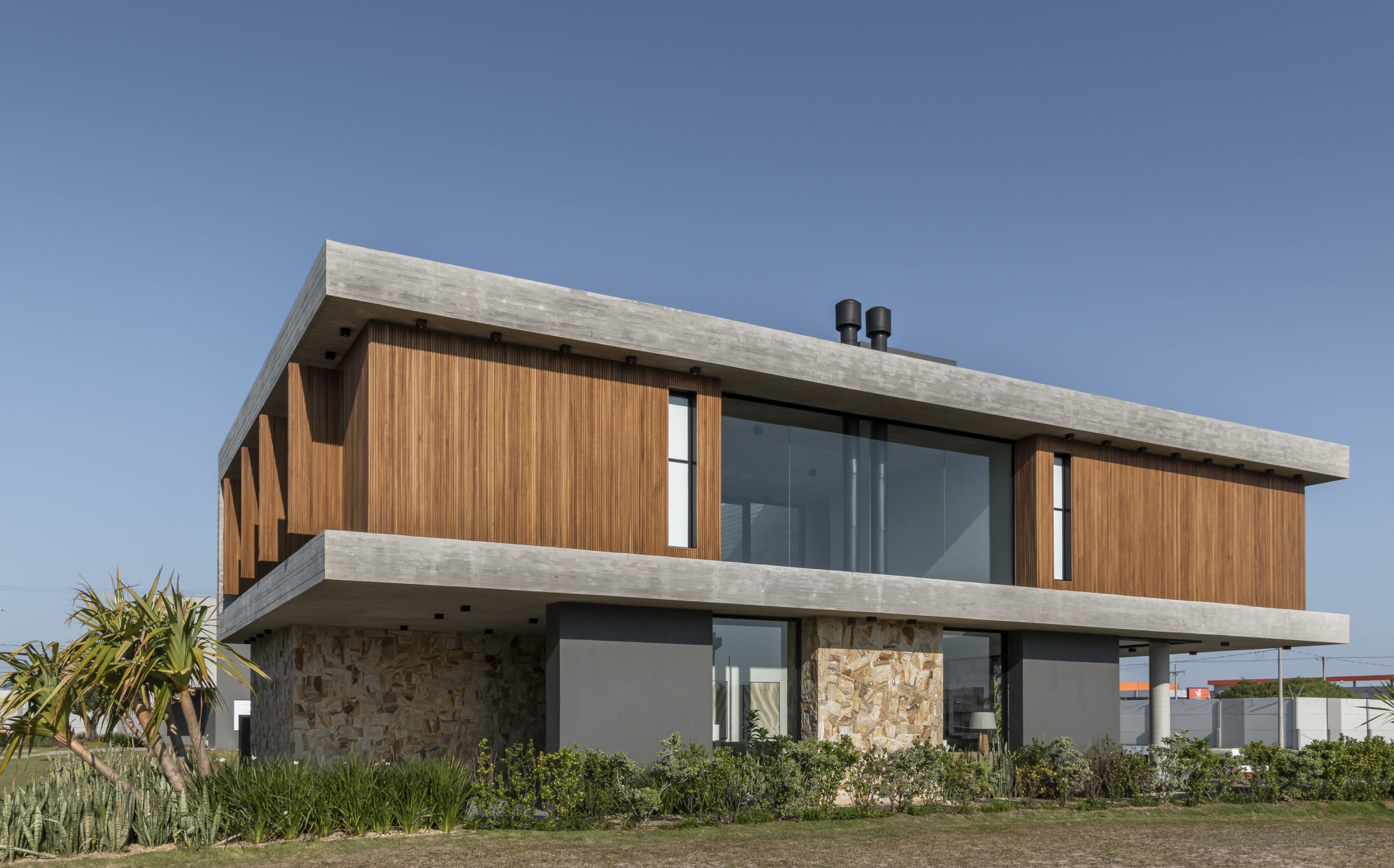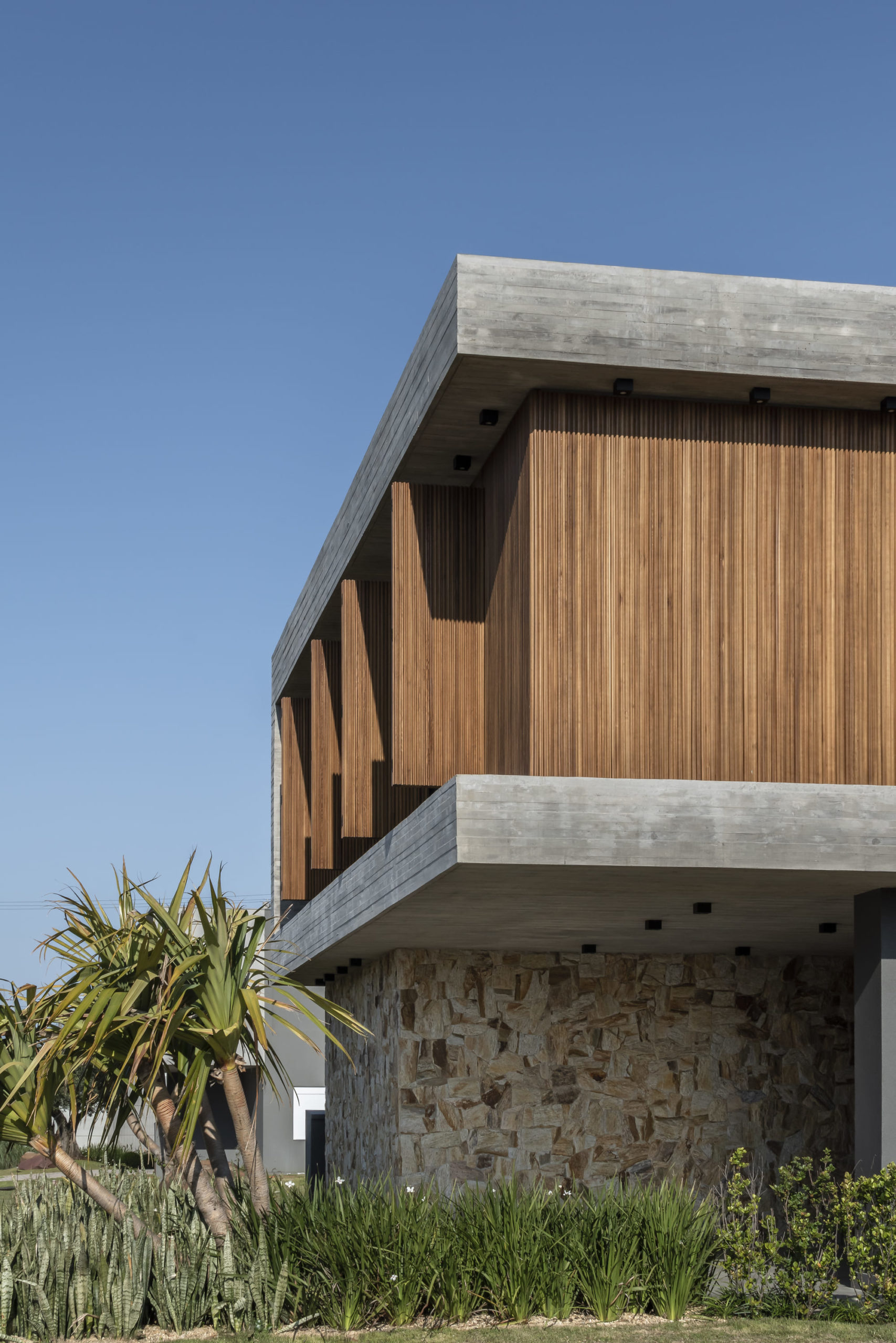 A composição de concreto, pedra e madeira em equilíbrio com a forma pura, tornam-se a sintetizam o projeto: beleza + contemporaneidade + funcionalidade.