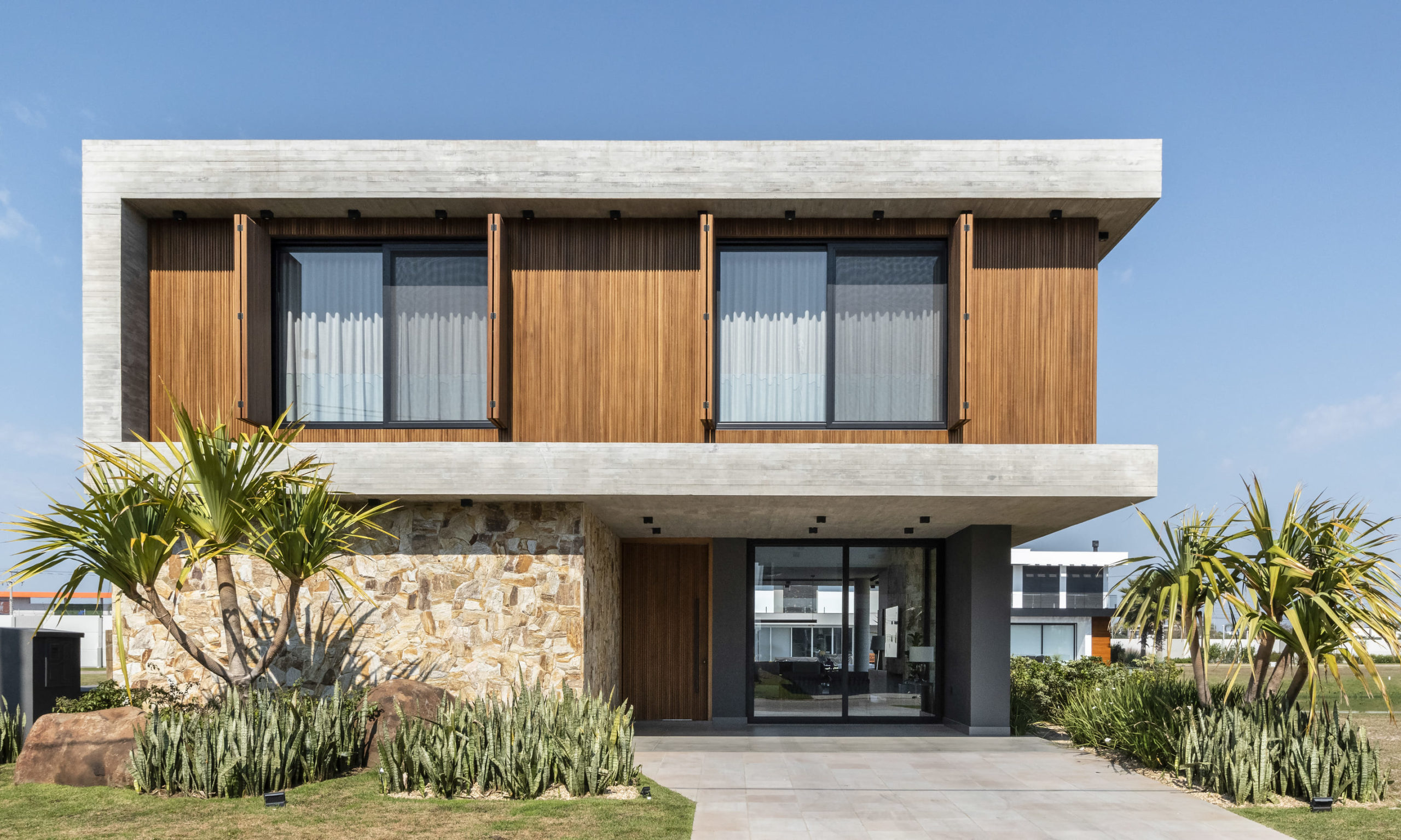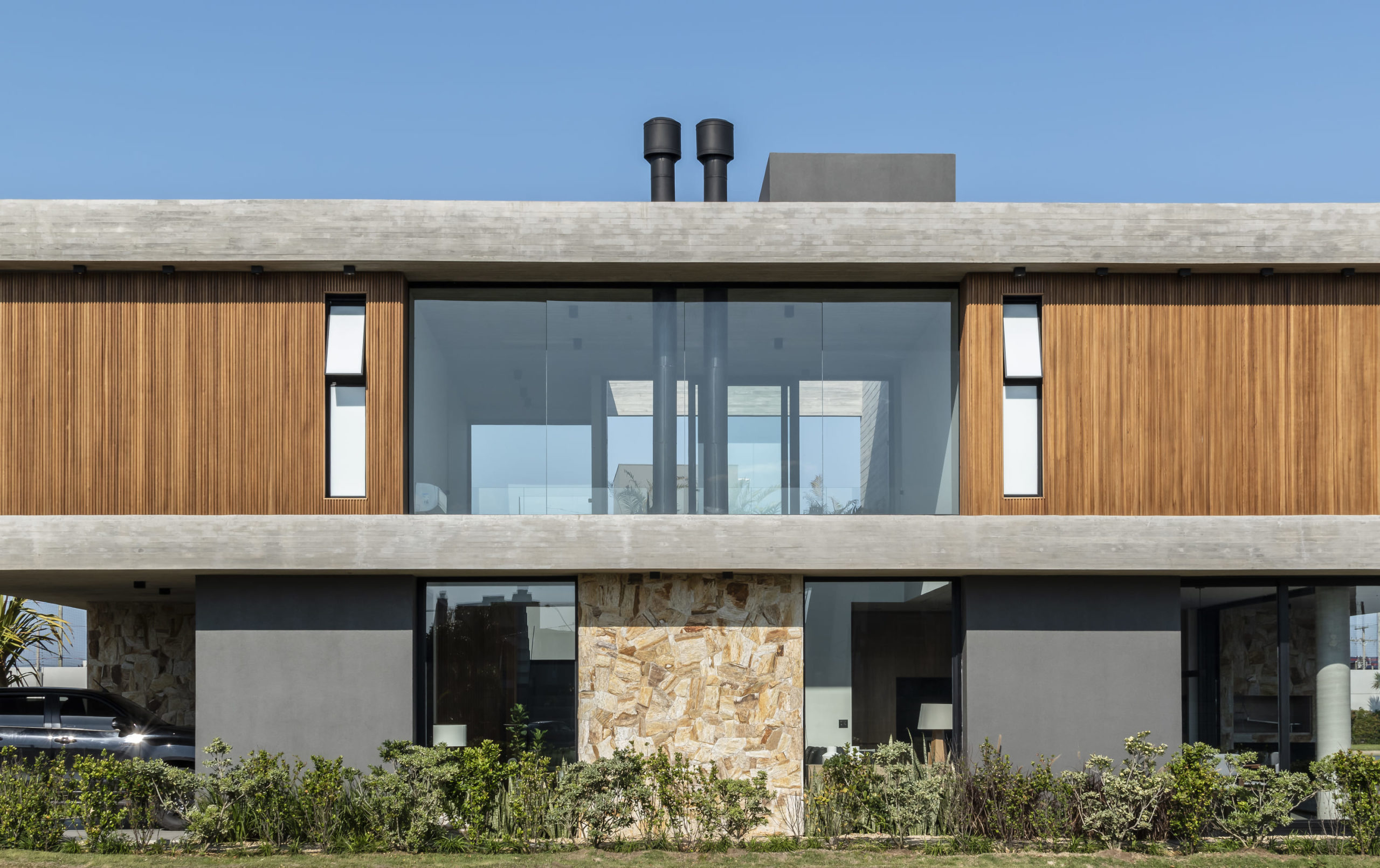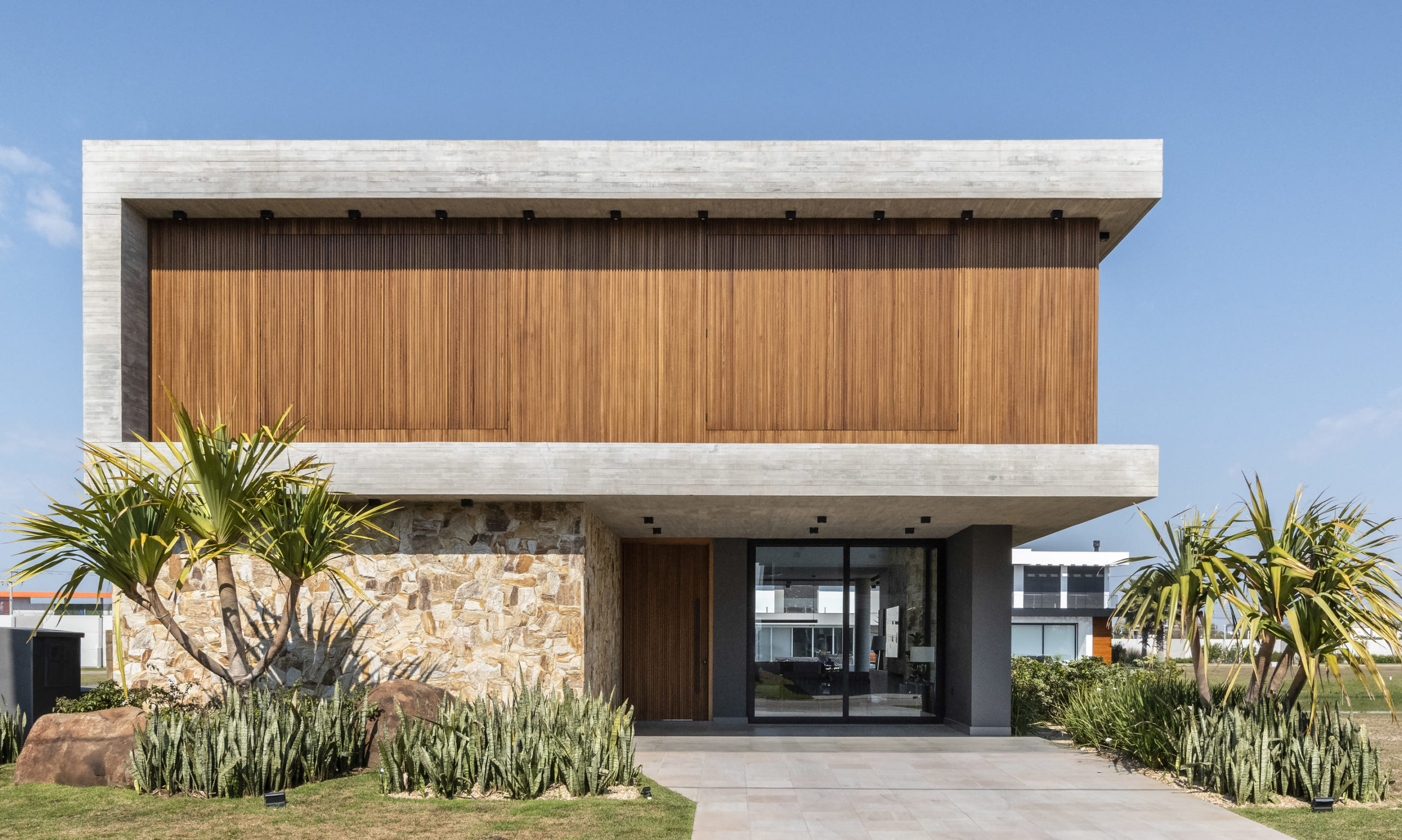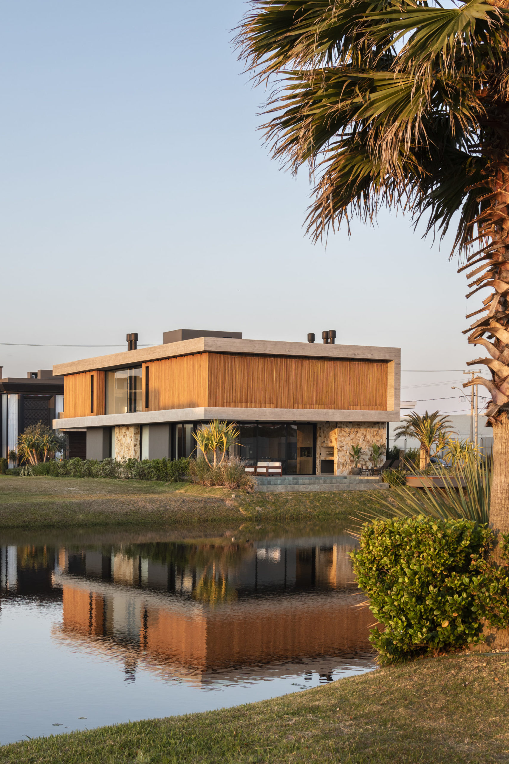 A composição de concreto, pedra e madeira em equilíbrio com a forma pura, tornam-se a sintetizam o projeto: beleza + contemporaneidade + funcionalidade.