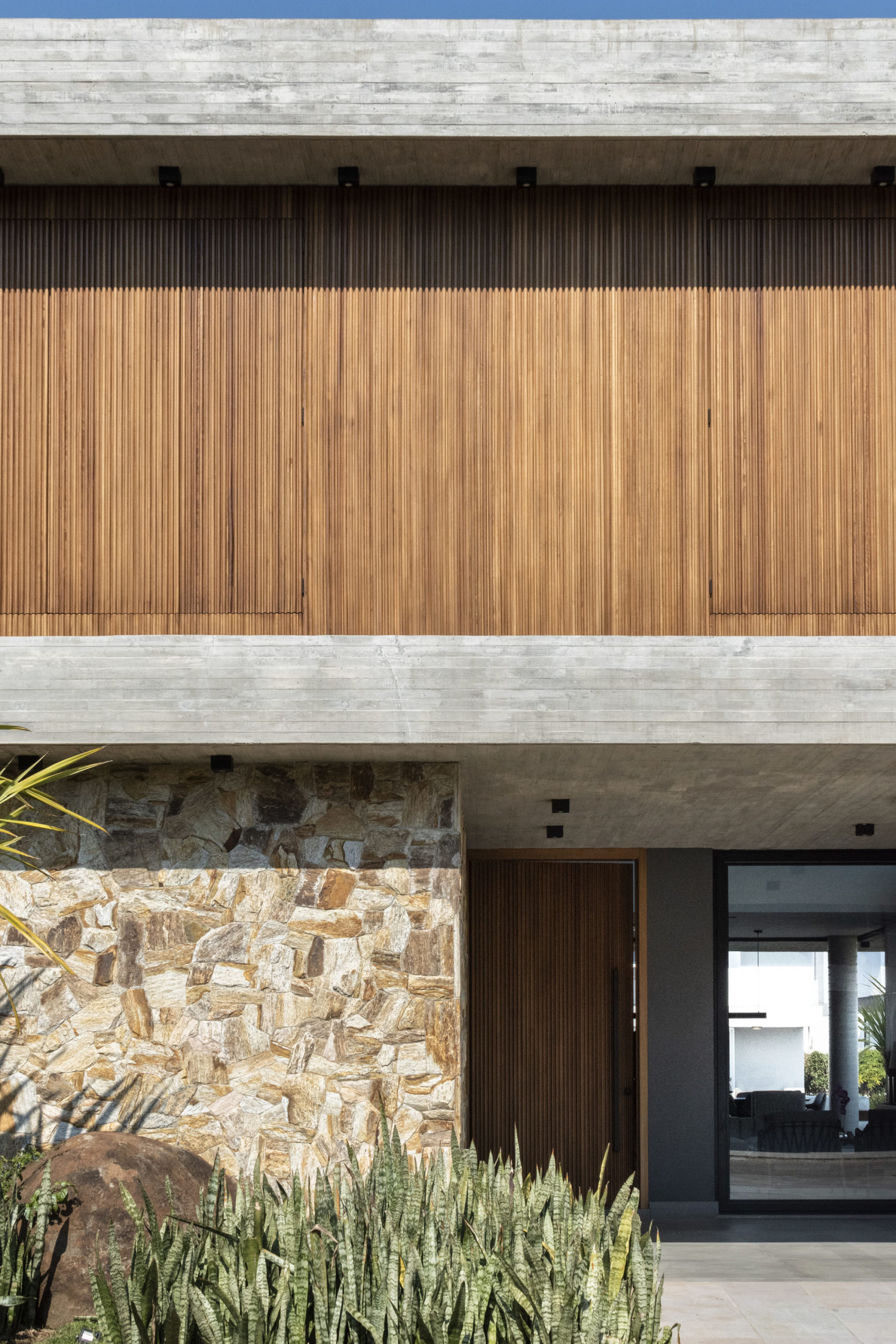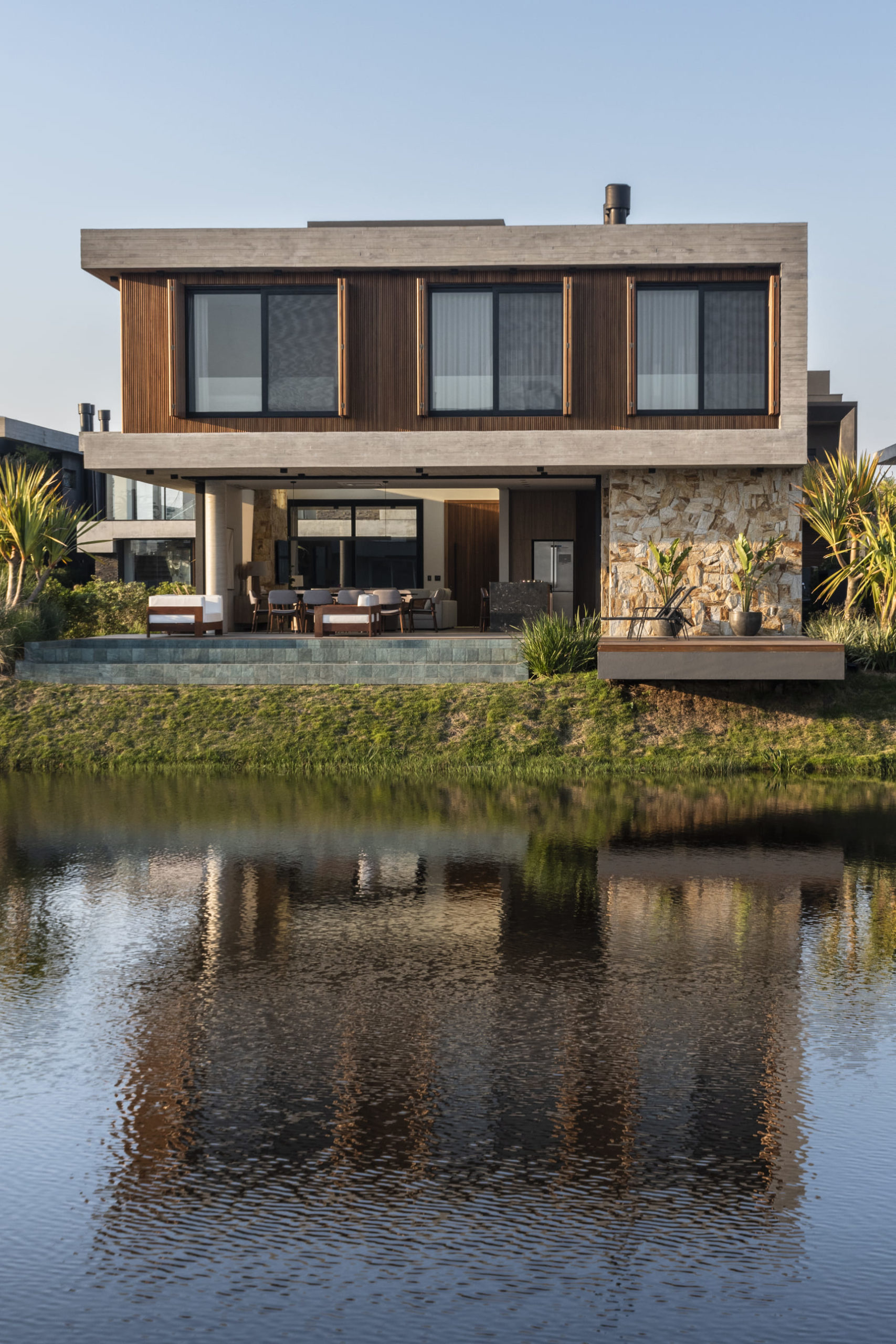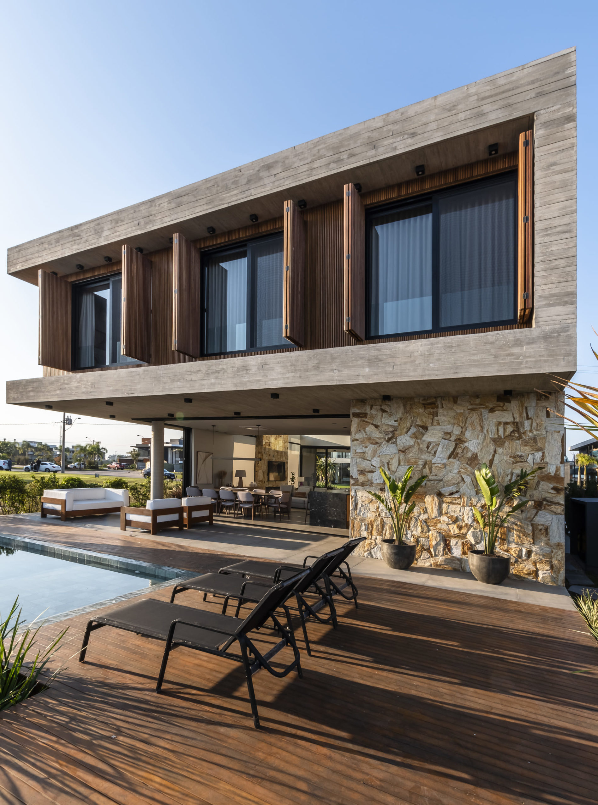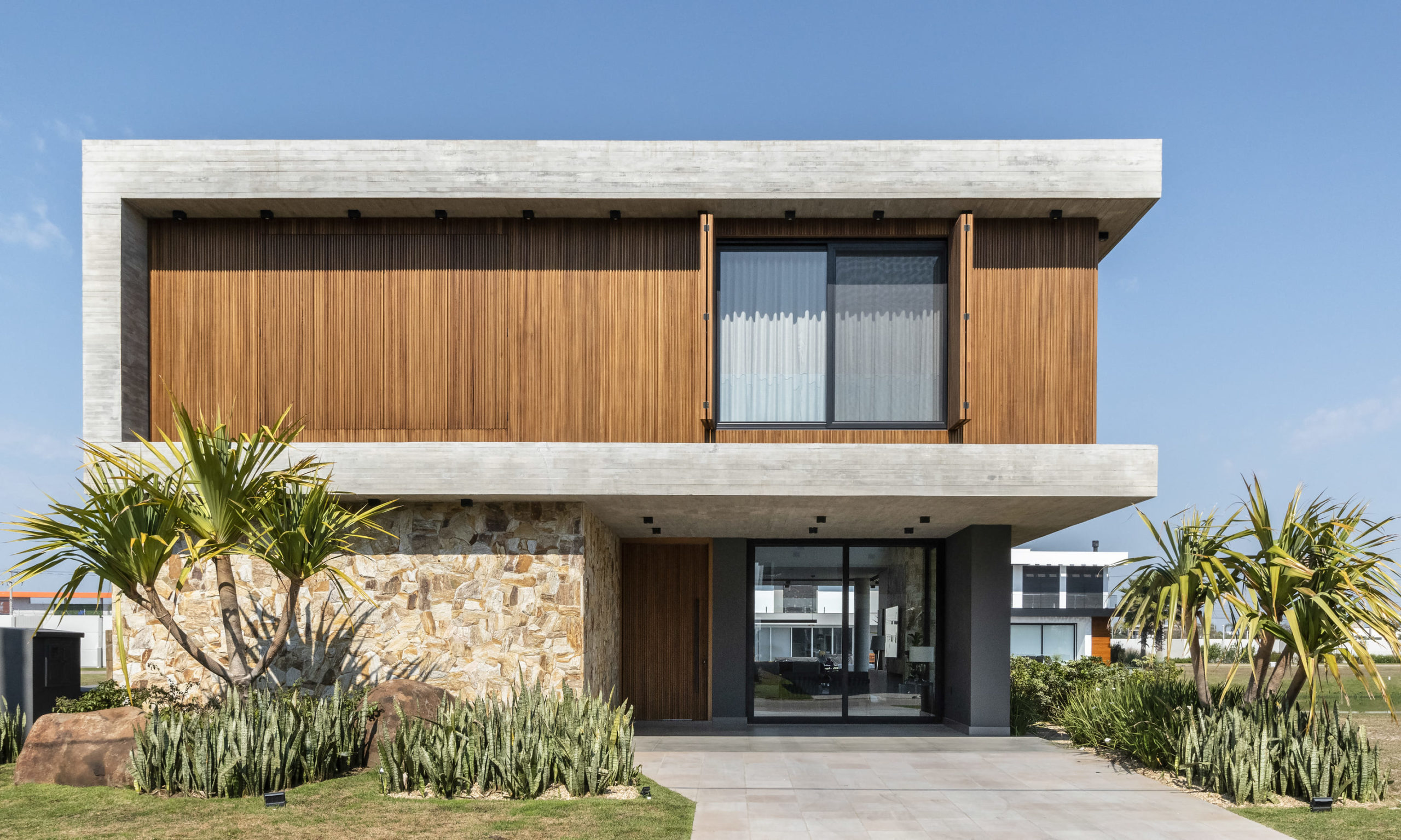 A composição de concreto, pedra e madeira em equilíbrio com a forma pura, tornam-se a sintetizam o projeto: beleza + contemporaneidade + funcionalidade.