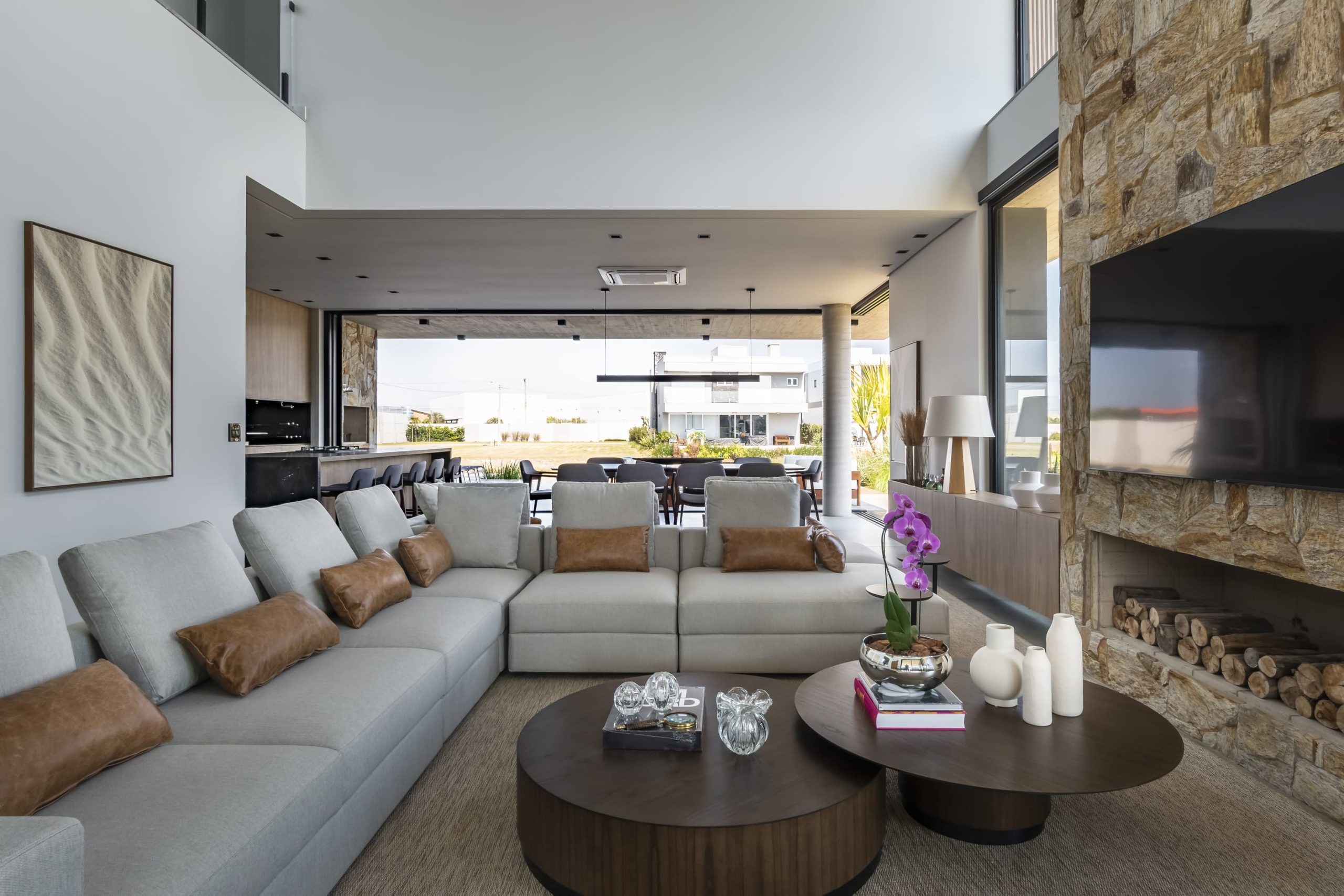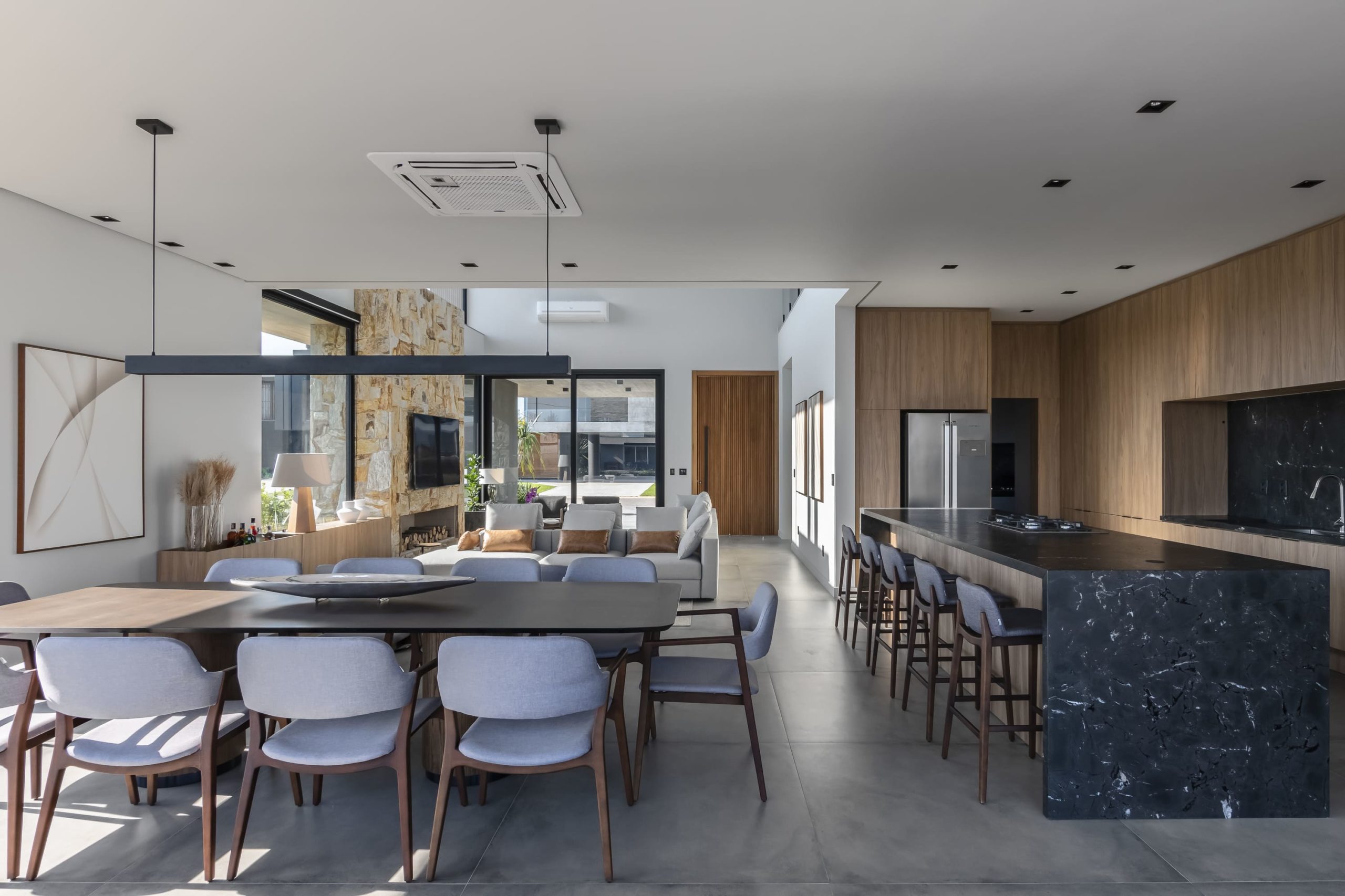 Como premissa de projeto, o térreo busca conectar os ambientes sociais, a vista do lago e montanhas, prezando a conexão interior/exterior.