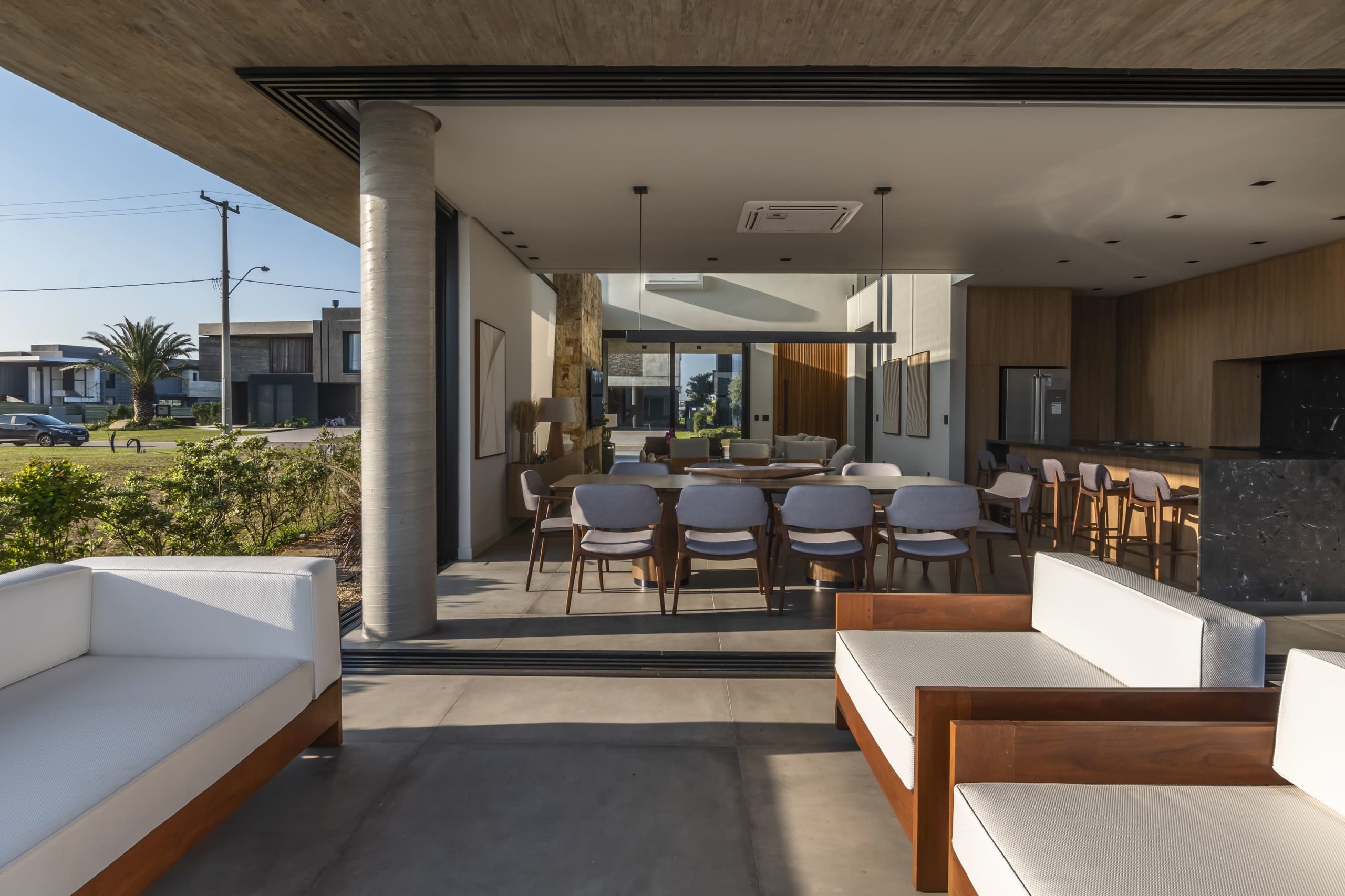 Para conectar ainda mais a varanda ao living, projetamos deck e varanda no mesmo nível interno da casa, para obter o maior conforto e amplitude da casa, sem ter aquele ‘’degrau’’ como incômodo ou limitante de espaços quando a esquadria aberta.