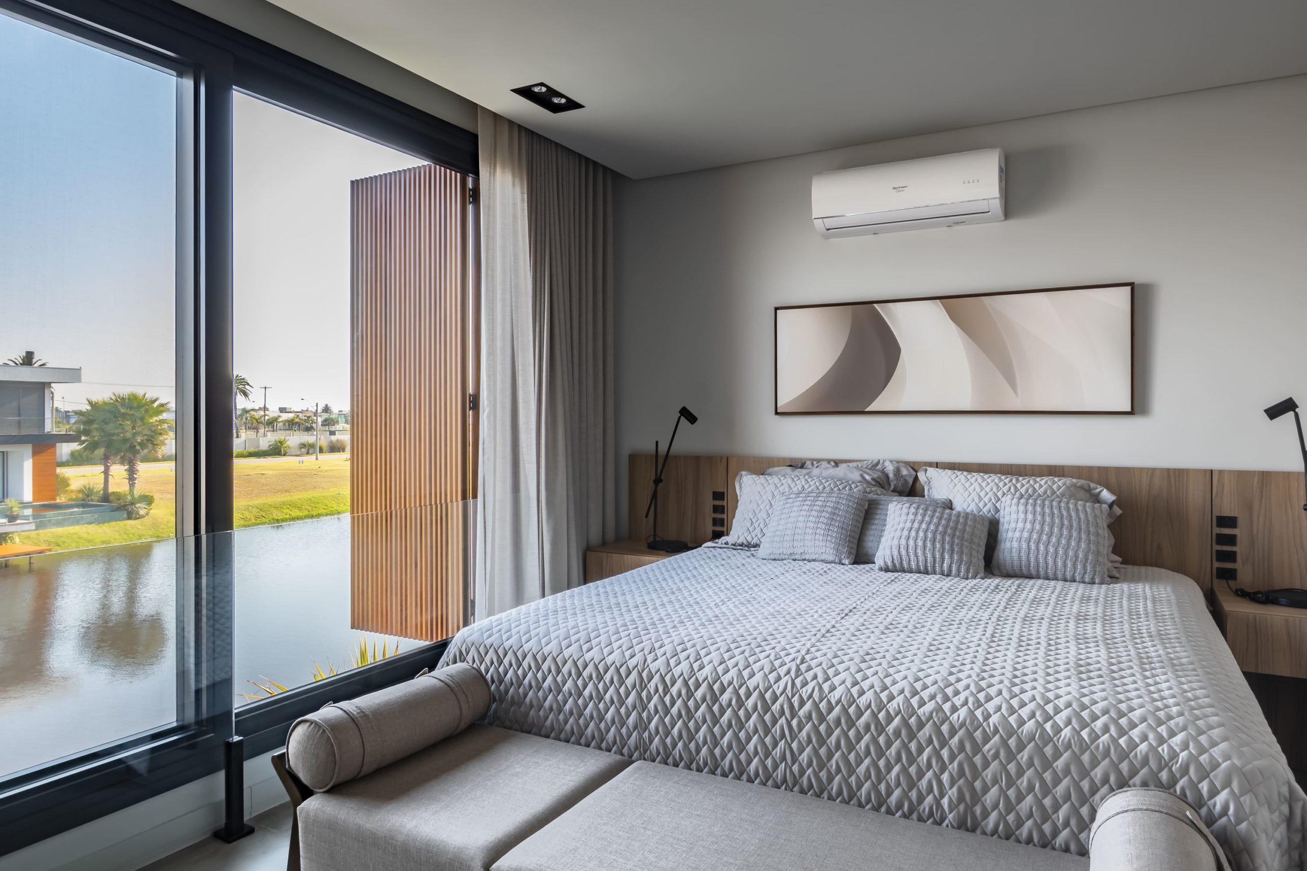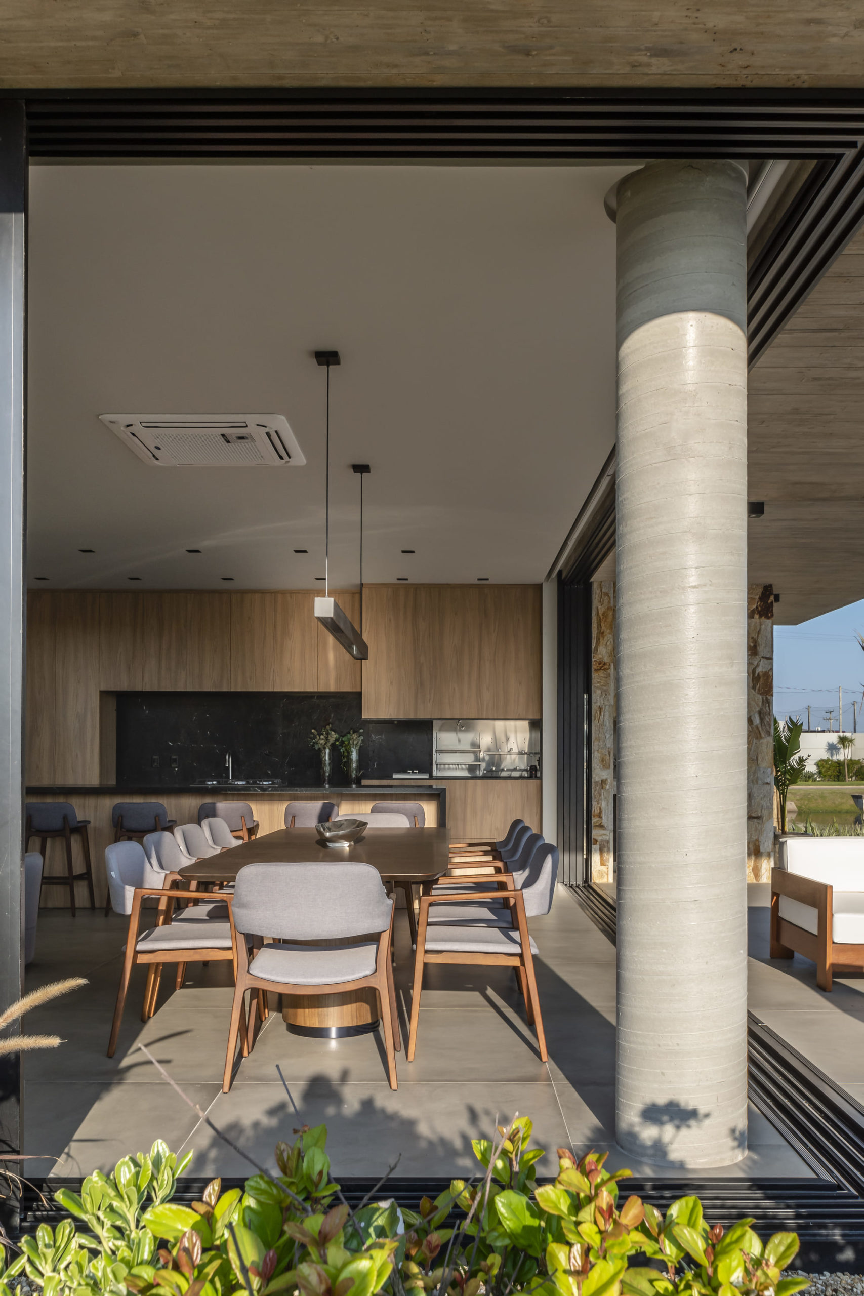 A esquadria oculta e ‘’canto livre’’ da varanda o tornam o projeto ainda mais conectado com o exterior, este canto livre projetado para que o usuário que estiver no gourmet contemple o lago e o pôr do sol na tarde.